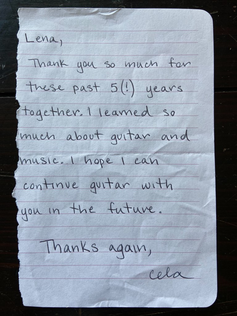 “I have been taking guitar lessons from Lena Vinz for about 9 years now and I absolutely love learning with her!! My knowledge and skills as a musician have grown tremendously through her teachings, would most definitely recommend!!!”